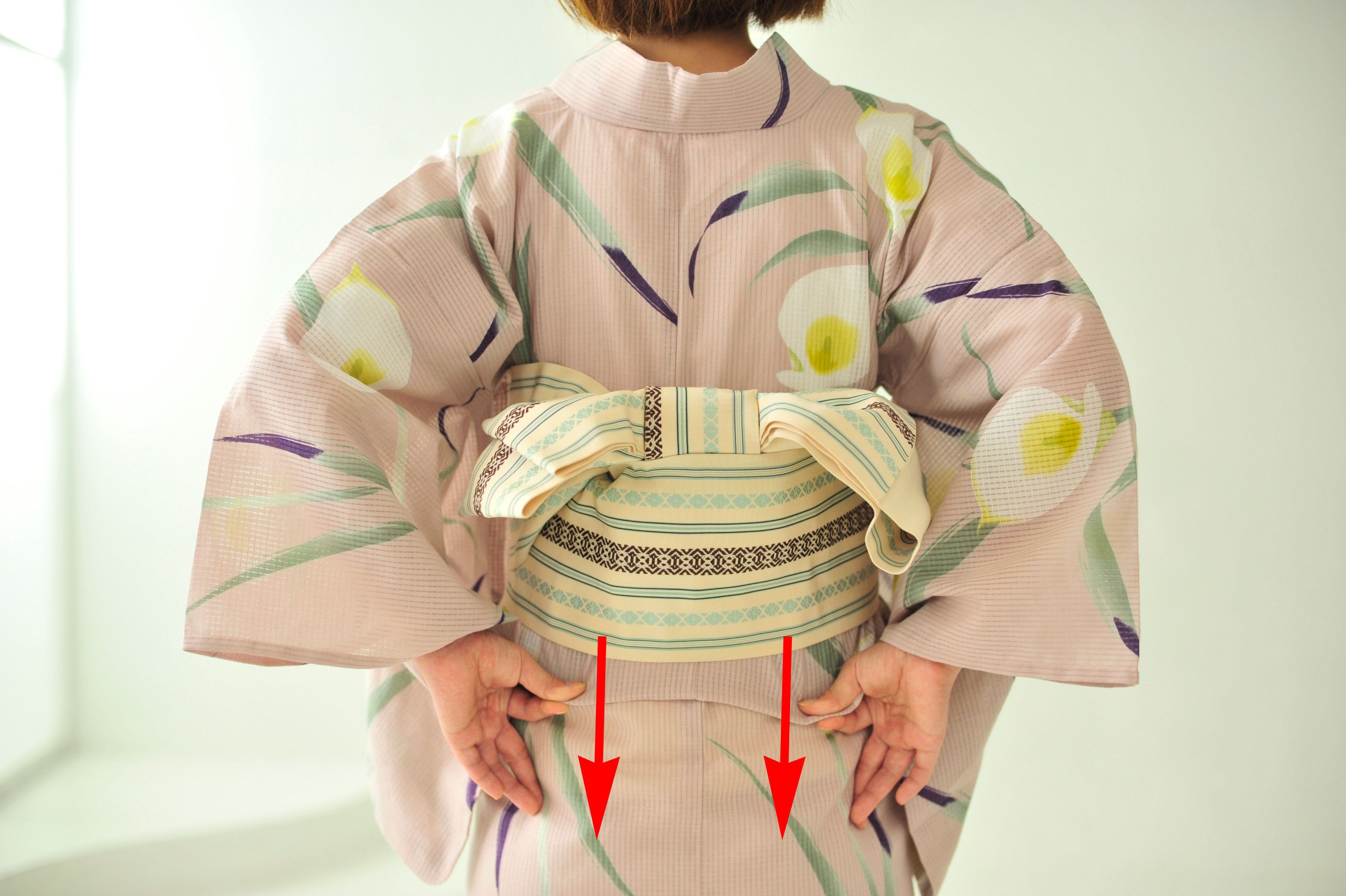 後ろのおはしょりを両手で持って、下に引っ張りましょう。背中のシワがとれ、凜とした美しい後ろ姿に戻ります。