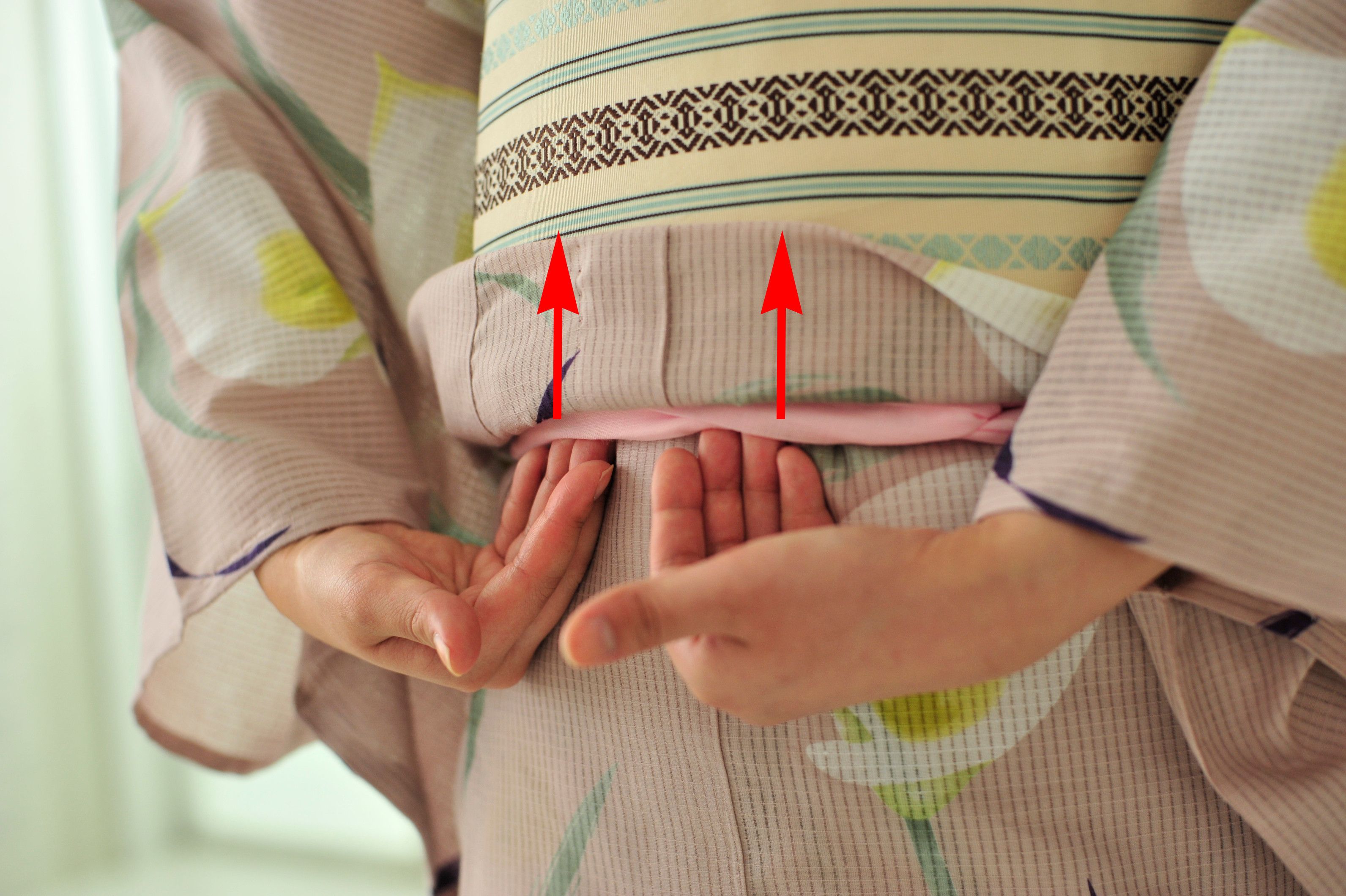 羽根を持ち上げ、結び目の下にできた隙間に小さく折りたたんだ手ぬぐいを押し込みます。これだけで、ゆるんでもたついていた帯がシャキッと安定! 手が届きにくい場所なので、一緒にいる人に手伝ってもらいましょう。