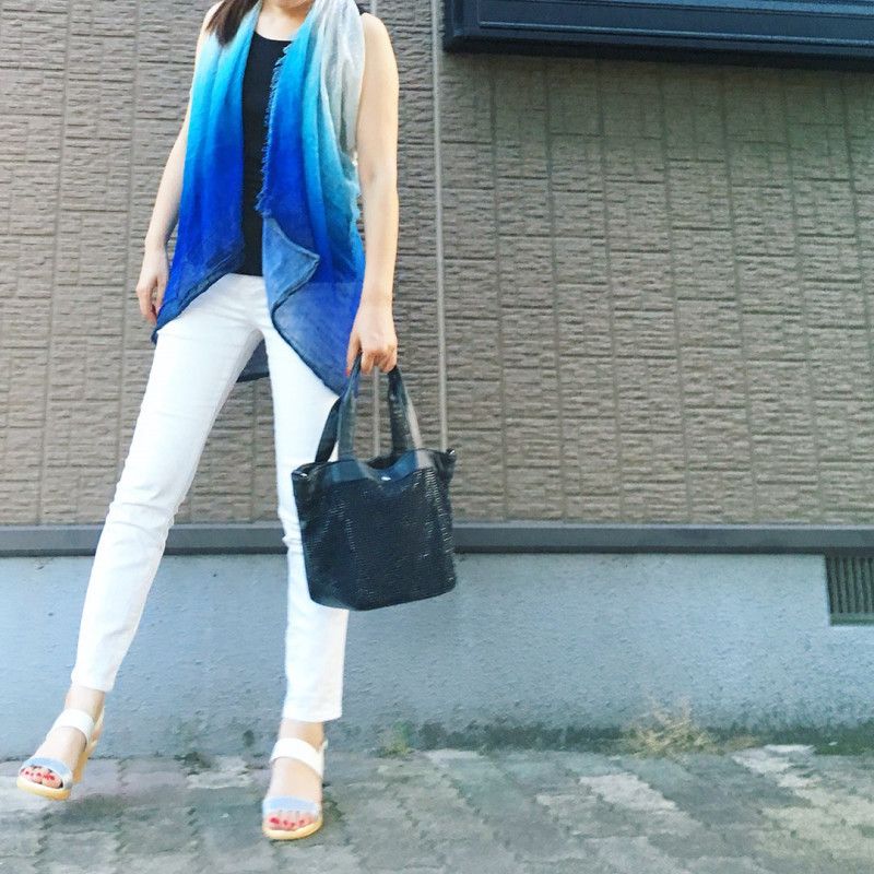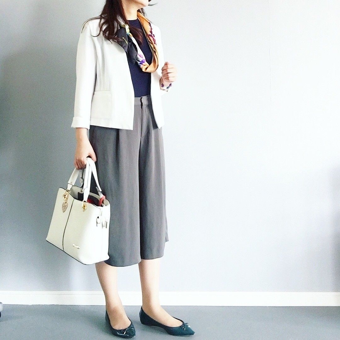ボリュームのあるスカーフアレンジしたバッグは目線が下がるので重心を下げた方が素敵に見えるナチュラルタイプにぴったり。