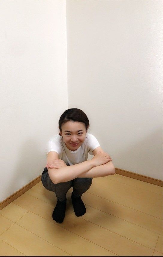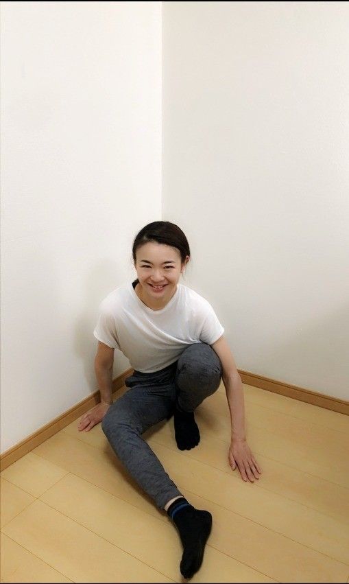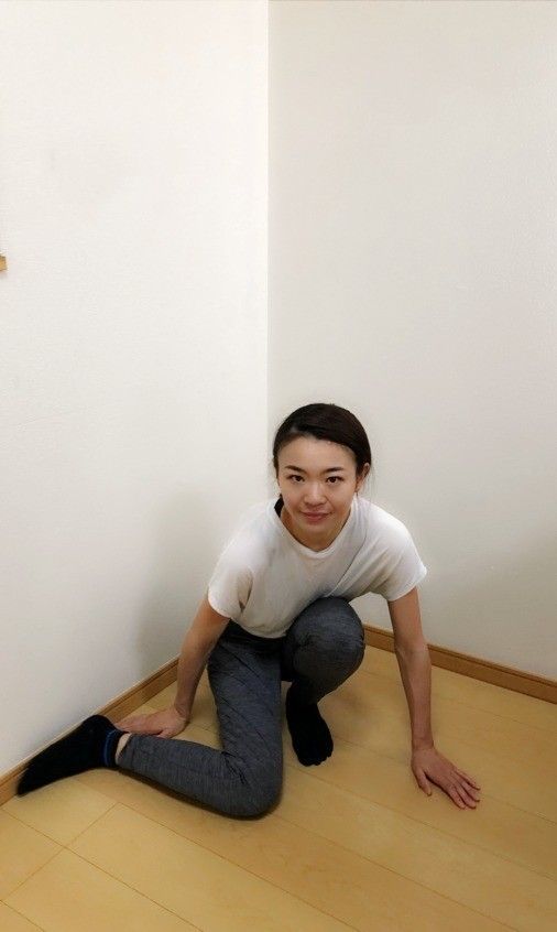 しゃがんだ状態から、片足ずつ、ゆっくりと膝を床に着けます。