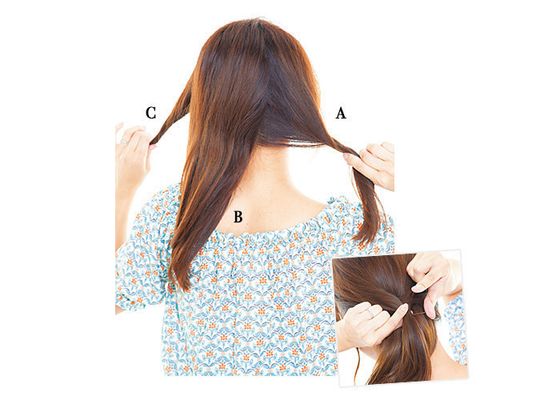 Step1 :髪を3つのパートに分け、AとCをゴムで結ぶ