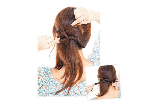 結び目の根元に、指が通るように穴を作ります。次に、結んだ毛束を上に持ち上げて、指を下から穴に入れ、毛束を引っ張り出すように通して“くるりんぱ”。左右にキュッと引き締めて崩れにくくします。