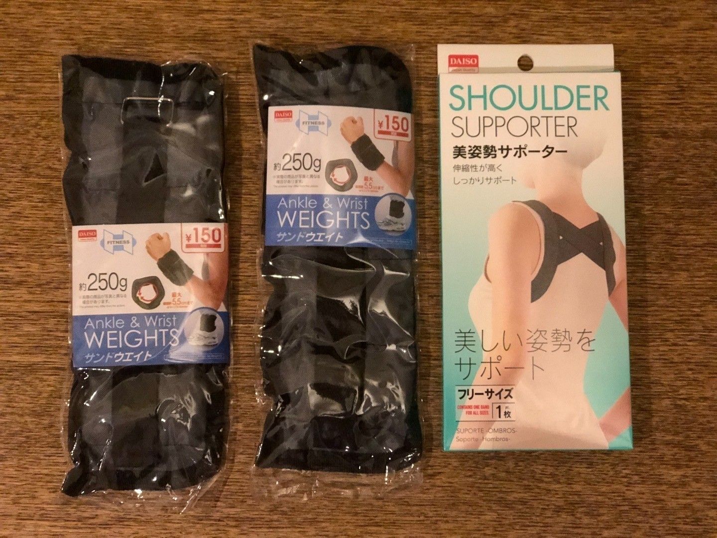 上記のような習慣を続け、産後1カ月で-6kgの減量に成功したmininoさん。ダイソーでダイエットサポートグッズも購入してみました。アンクル&リストウェイトは、家事の間足首につけて“ながら筋トレ”に。美姿勢サポーターは、授乳中の猫背防止のために。育児で忙しい中でも、日常生活がトレーニングになるアイデアです♪