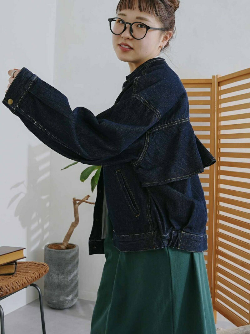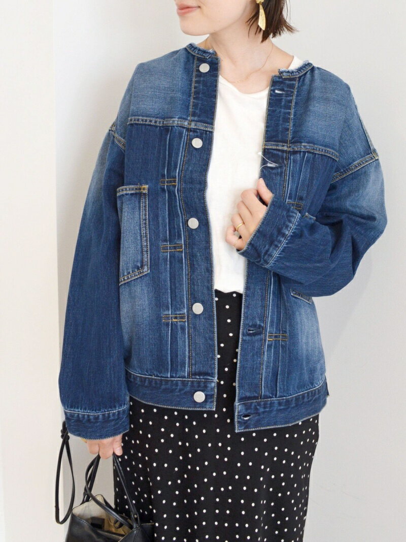 えりなしのデニムジャケットはフェミニンな印象。オーバーサイズを選べばさらに今風に。肌寒いときにさっと羽織るのにちょうどよいですね。