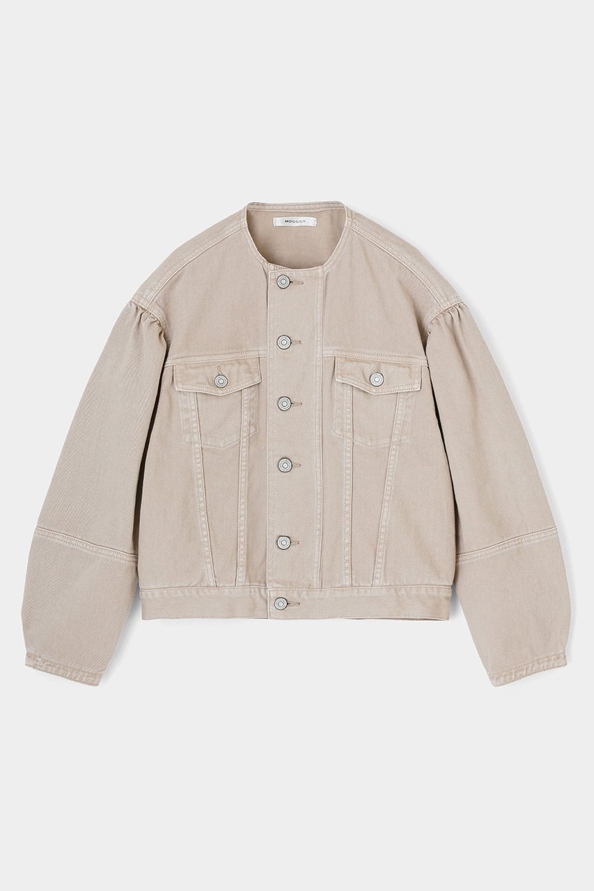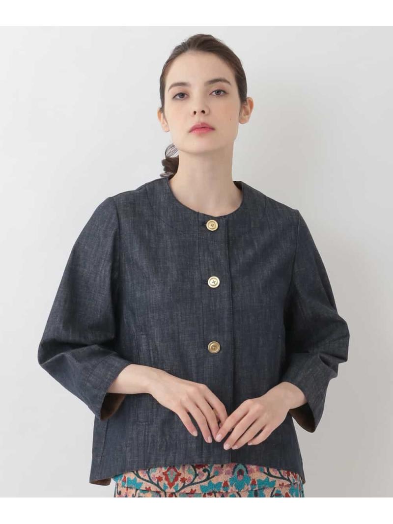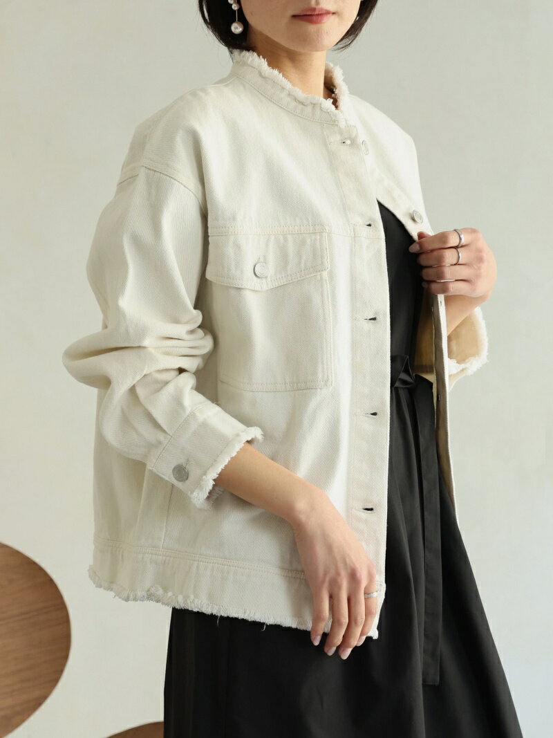 こちらはフェード感のあるノーカラーデニムジャケット。オーバーサイズながらもショート丈で、スタイルをよくみせてくれます。