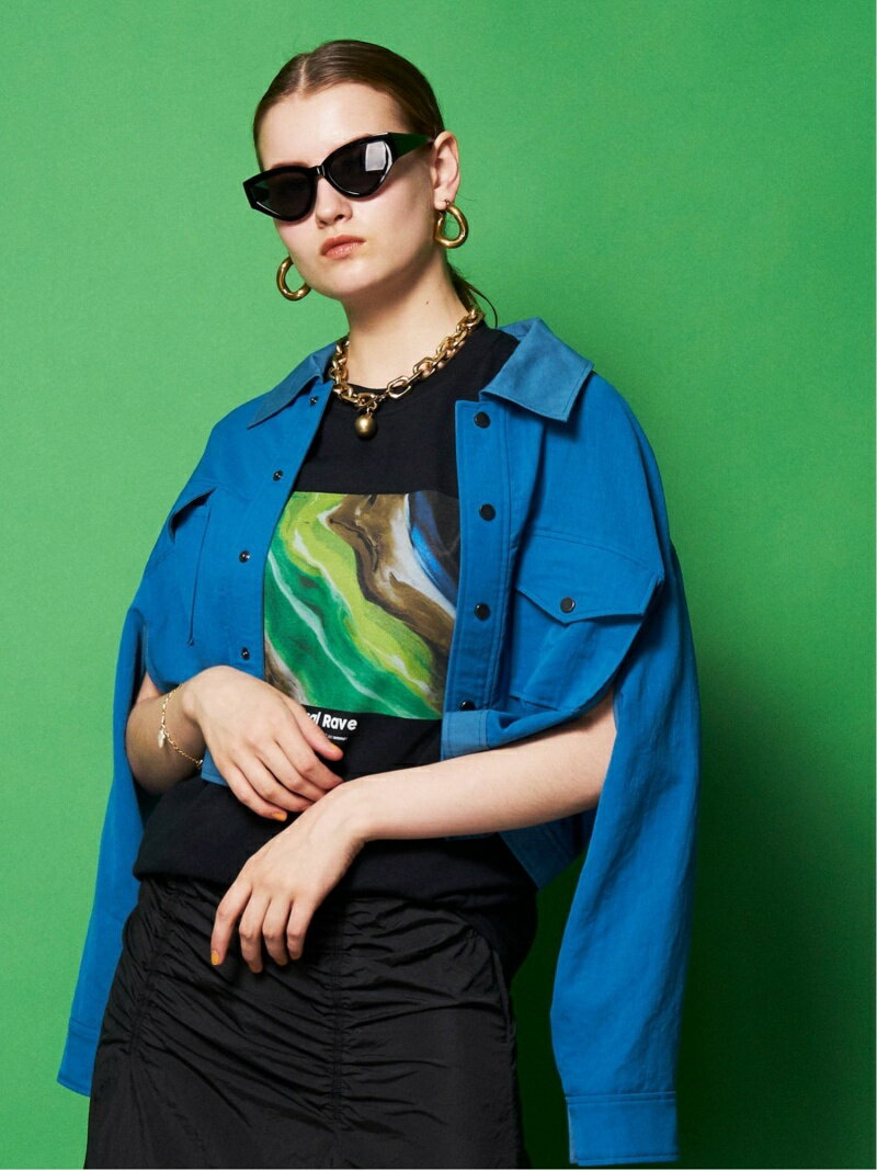 トレンドのショート丈を取り入れたこちらのGジャン。シアー素材で軽やかに着こなせるのがポイント。パキッとしたブルーがクールな印象をプラスします。