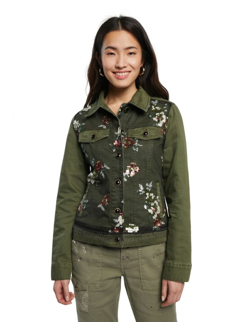 無地のデニムジャケットが多いなか、花柄のデニムジャケットを選べばまた違った印象になります。同系色のパンツと合わせれば、甘くなりすぎず着こなすことができます。