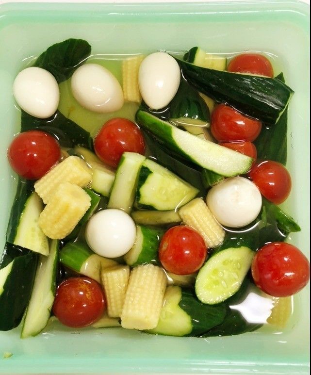 いつでも野菜と酢がとれるよう、季節の野菜をマリネにして作り置きしておきます。写真はきゅうり、トマト、ピクルス。