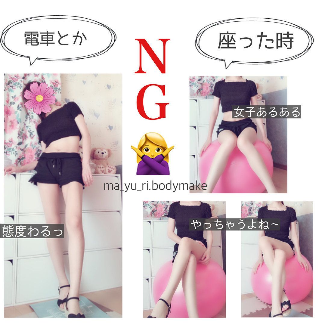 自分の脚の形が嫌いだったというma_yu_ri.bodymakeさん。美脚に近づくために行ったのが、座っているときや立っているときなど、日常生活での姿勢の改善です。内股や反り腰、猫背、脚組み、片足重心などを避け、まっすぐ正しい姿勢を意識することで、O脚や前もも・外ももの張りに変化が生じてきたのだとか。