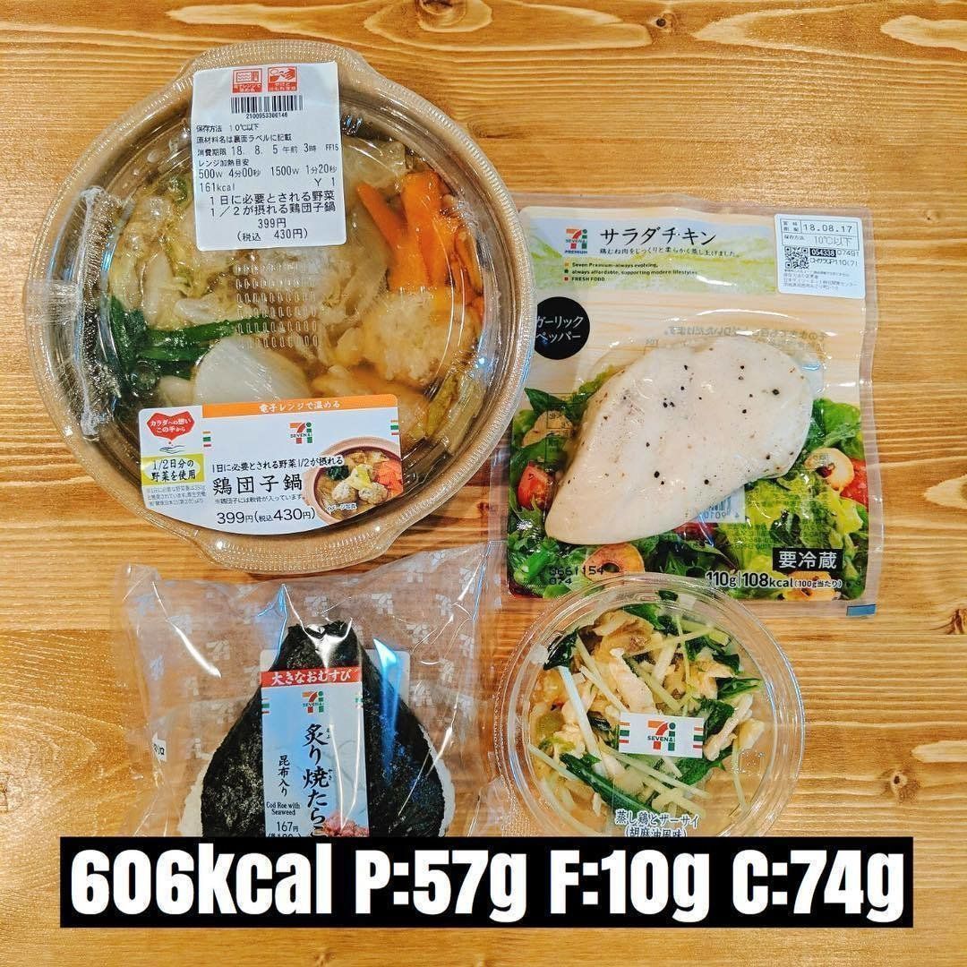 コンビニの食品でも、PFCバランスを意識すればダイエットメニューに応用することができます。こちらは、サラダチキンと鶏団子鍋で、タンパク質をしっかり摂取できるダイエットランチ。おにぎりを玄米に変えたり、鶏団子鍋のスープは残したりして、塩分を調整しても◎。しっかりとカロリーをとって食事をしたい日におすすめのメニューです。