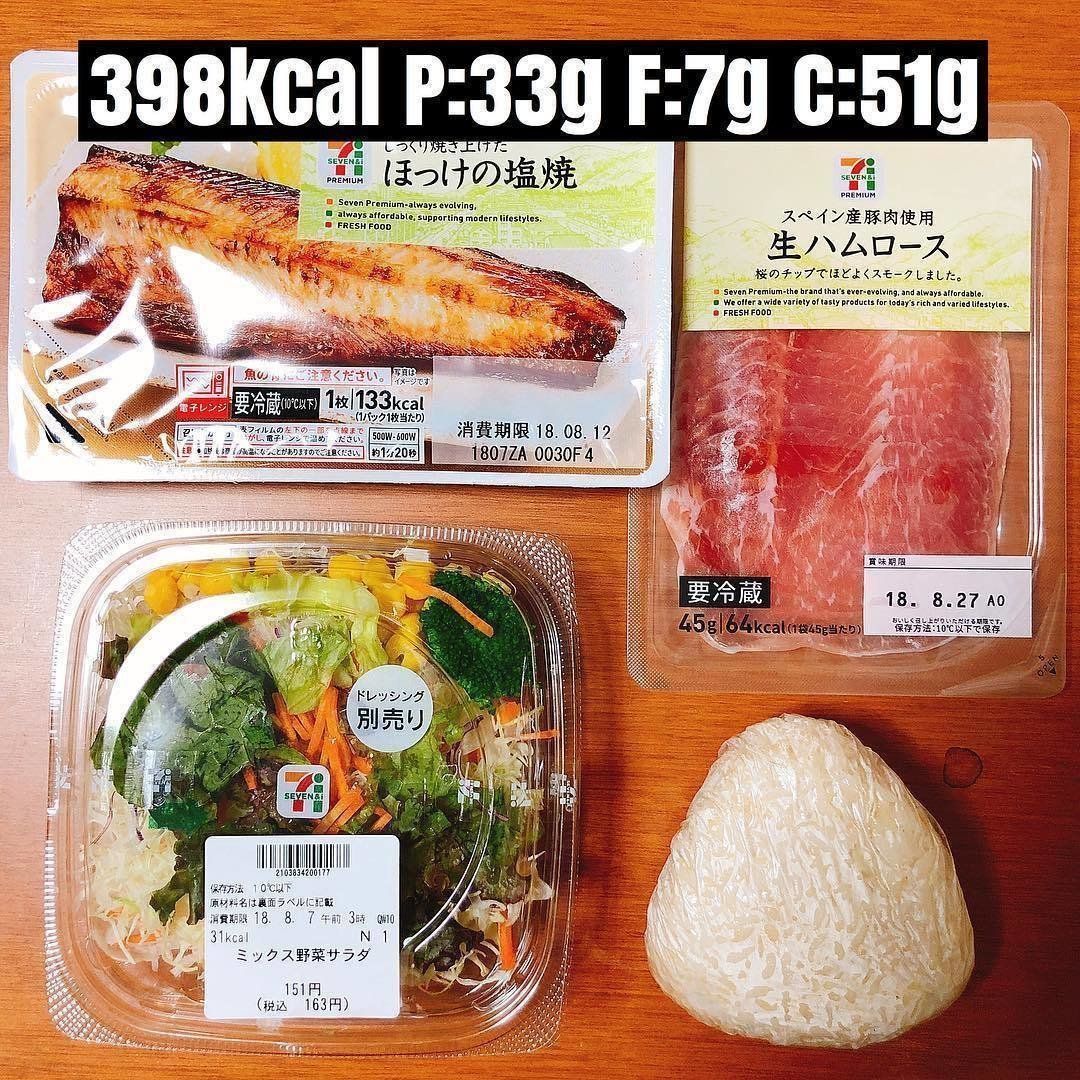 こちらもコンビニ食品を使ったメニュー。高タンパクなほっけの塩焼きをメインに、玄米おにぎりでエネルギー、野菜サラダでビタミン・ミネラルも補給できます。サラダはドレッシングをかけずに、塩気のある生ハムと一緒に味わって食べるといいそうです。コンビニでもいろいろな焼き魚が売られているので、ぜひ活用したいですね。