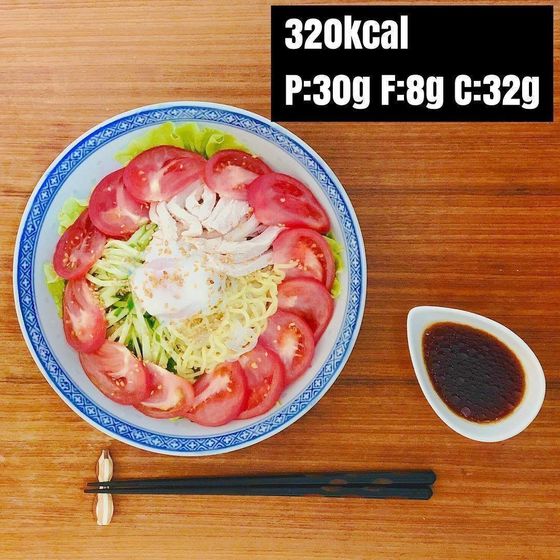 高カロリーそうなイメージがある冷やし中華は、麺にしらたきを追加することで通常よりもヘルシーに。ハムは鶏胸を使った鶏ハム、卵焼きは温泉卵に変えて、脂質を減らすことを意識しながら、たんぱく質をしっかりととれるように工夫しています。一皿で野菜もたんぱく質もとれるうれしいメニューです。