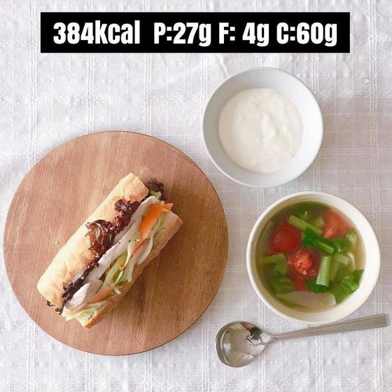 フランスパンを使ったベトナムのサンドイッチ・バインミーに、ヨーグルト、野菜スープを添えたメニュー。バターが入っていないフランスパンは、食パンやクロワッサンなどに比べてエネルギーや脂質が低いのだそう。噛み応えがあるので、満腹中枢が刺激され食べすぎ防止効果も。鶏ハムとナンプラーをかけた酢の物を挟むだけで、簡単に作れますよ!