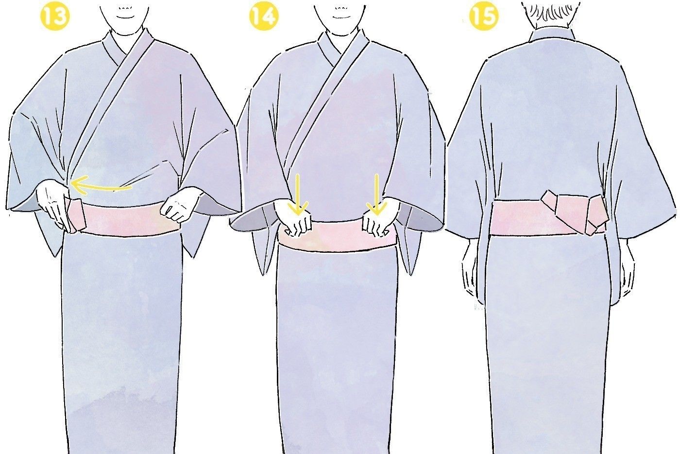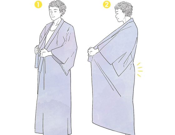 2.体の正面で左右の衿先を持ち、前に引いて浴衣を腰に沿わせます