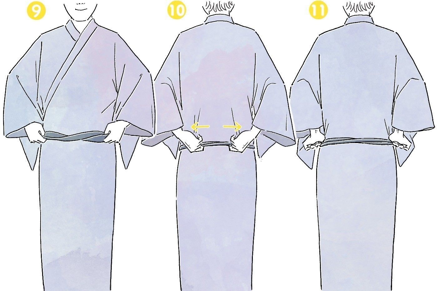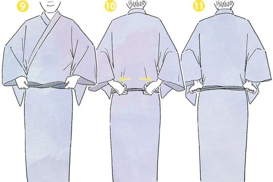 10.腰ひもに両手の指を入れ、背中の中心から脇に向かって指を流すようにしてしわを取ります