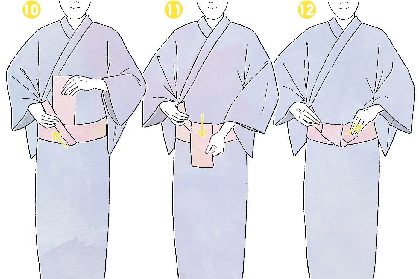 着付けが完成したら、続いては帯結び。男性の帯結びの中で、最も定番な「貝の口」の結び方をご紹介します。