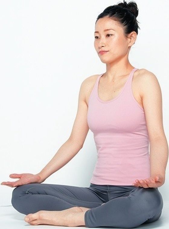 あぐらをかくと自然に骨盤が立ちます。腹筋を意識して、背中が丸くならないよう注意!