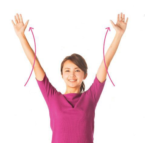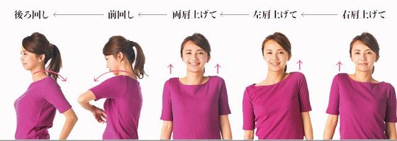 左右交互、同時に肩を上げ、片方ずつ前後に回します。大きく回すことがポイント。やればやるほどスムーズに動かせるようになるので、気づいたときに動かす習慣にするのが◎。