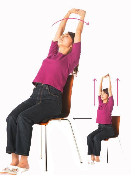 いすに座り、両手を持って背骨を伸ばすイメージで上に思いっきり引き上げます(5秒間)。伸びた状態で、5秒かけてそのまま背もたれにゆっくり倒れます。後ろに倒れると危険なので、キャスターつきのいすはNG。
