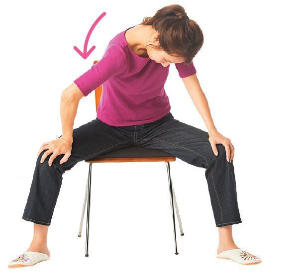 椅子に座って、膝を曲げた状態で両足を広げます。両手を両膝に置き、右手で右膝を外側に押します。背中を丸め上半身を左側に傾け、痛気持ちいいと感じる角度で伸ばします(15秒)。同様に反対側も行います。