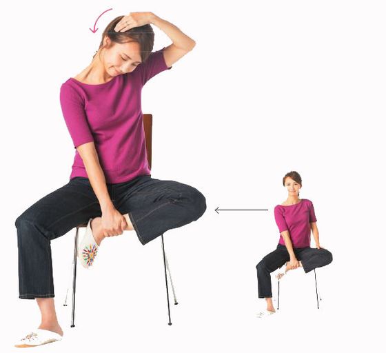 椅子に座り、右手で左足首を持ちます。右手が足の重みで下に引っ張られるのを感じながら、首を左下に傾けます(15秒伸ばします)。左手で首から肩甲骨周りが伸びるよう、頭を軽く押します。