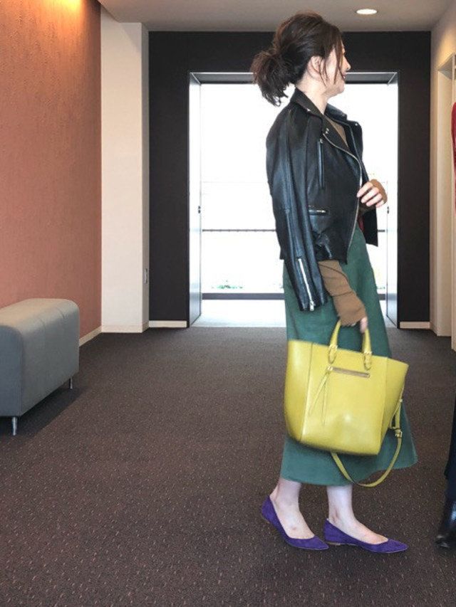 「ライダースジャケット」の本来持つ辛口テイストと、女性らしいロングスカートとのフェミニンテイストが混ざり合い、程良い甘辛MIXコーデに!さらに写真のように、靴やバッグの色で遊べば、大人の抜け感が漂うスタイリングに!