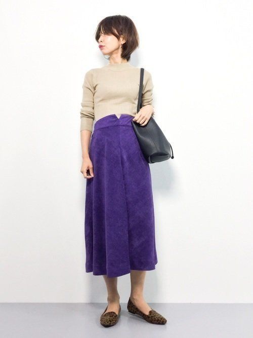 秋冬に着たいコーデュロイスカートは、パープルを選んで脱・ほっこりコーデに。女性らしいフレアスカートをフィット感あるニットできれいめに仕上げた大人の秋コーデ。ニットはROSE BUDのもの。
