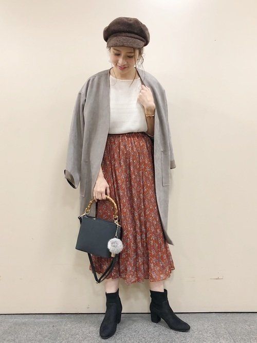 シフォンプリーツの花柄スカートはフェミニンさを引き立ててくれるアイテム。小花柄ならクラシカルな雰囲気で大人の可愛さを演出できます。トレンドカラーのブラウンベースで大人可愛い秋コーデ。アウターはDiscoatのもの。