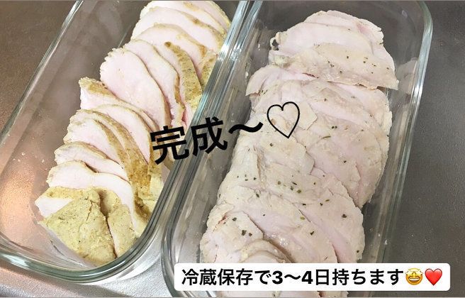 こちらは、鶏胸肉を買うたびに作っているという、自家製サラダチキン。肉にフォークで数か所穴をあけたら、調味料を揉み込み、冷蔵庫で半日ほど寝かせます。調理する30分前に胸肉を取り出して耐熱袋に密封し、熱湯に沈めてお湯が冷めるまで放置したら完成です!自家製なので、味付けや塩分をお好みで調整できるのがいいですね。