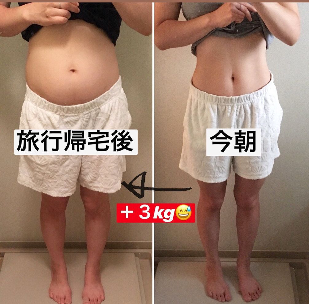 楽しい旅行中は、せっかくならおいしいものをたくさん食べたいですよね。aya.diet_lifeさんは、3kg増量した旅行から帰宅後、普段よりも多めの水分補給とオイルマッサージでむくみを解消しました。また、食事の際には野菜をメインにして糖質を少なめにすることで、4日間で旅行前の体型に戻すことができたのだそうです。