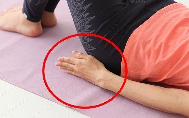 息を吸いながら、手(小指側)と足で床を押すようにして腰を持ち上げます。そのままゆっくり上下に4回バウンドさせましょう。このときお尻を床にうちつけないように注意。