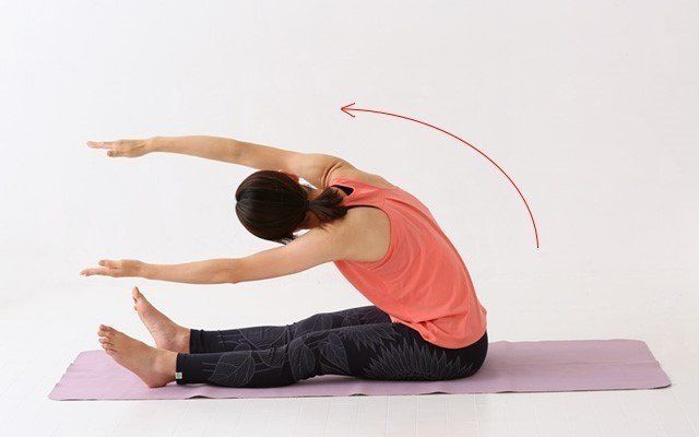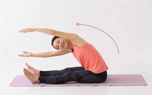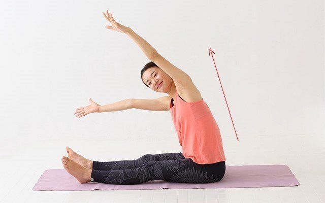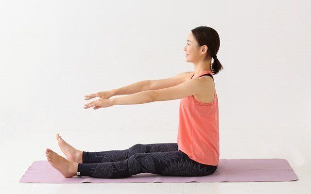 両脚を前に伸ばし、肩幅に開いて座ります。両腕も肩幅に開き、水平にして真っすぐ伸ばします。