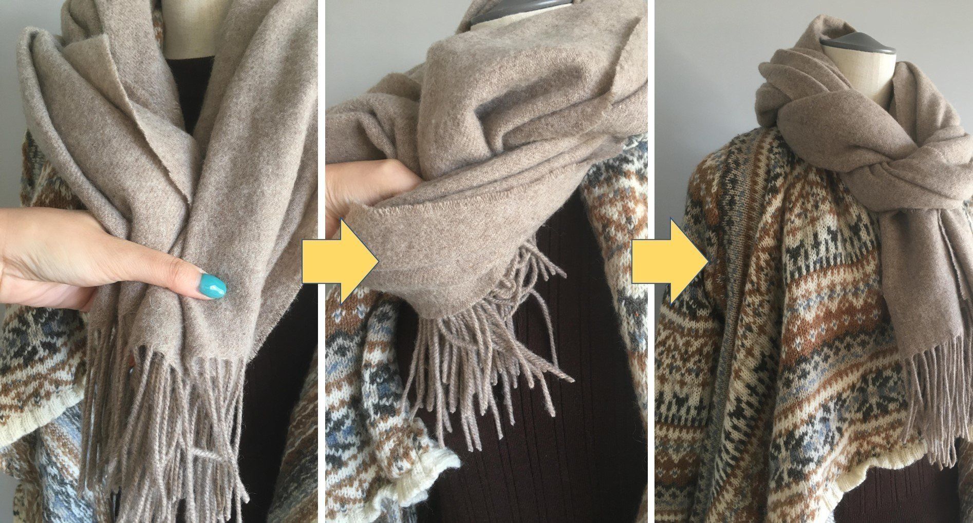 よくある「首にぐるりと1周する」ストールアレンジ。カジュアルなニットカーディガンに合わせて、この巻き方をする人も多いと思いますが、そこからひと工夫しませんか?