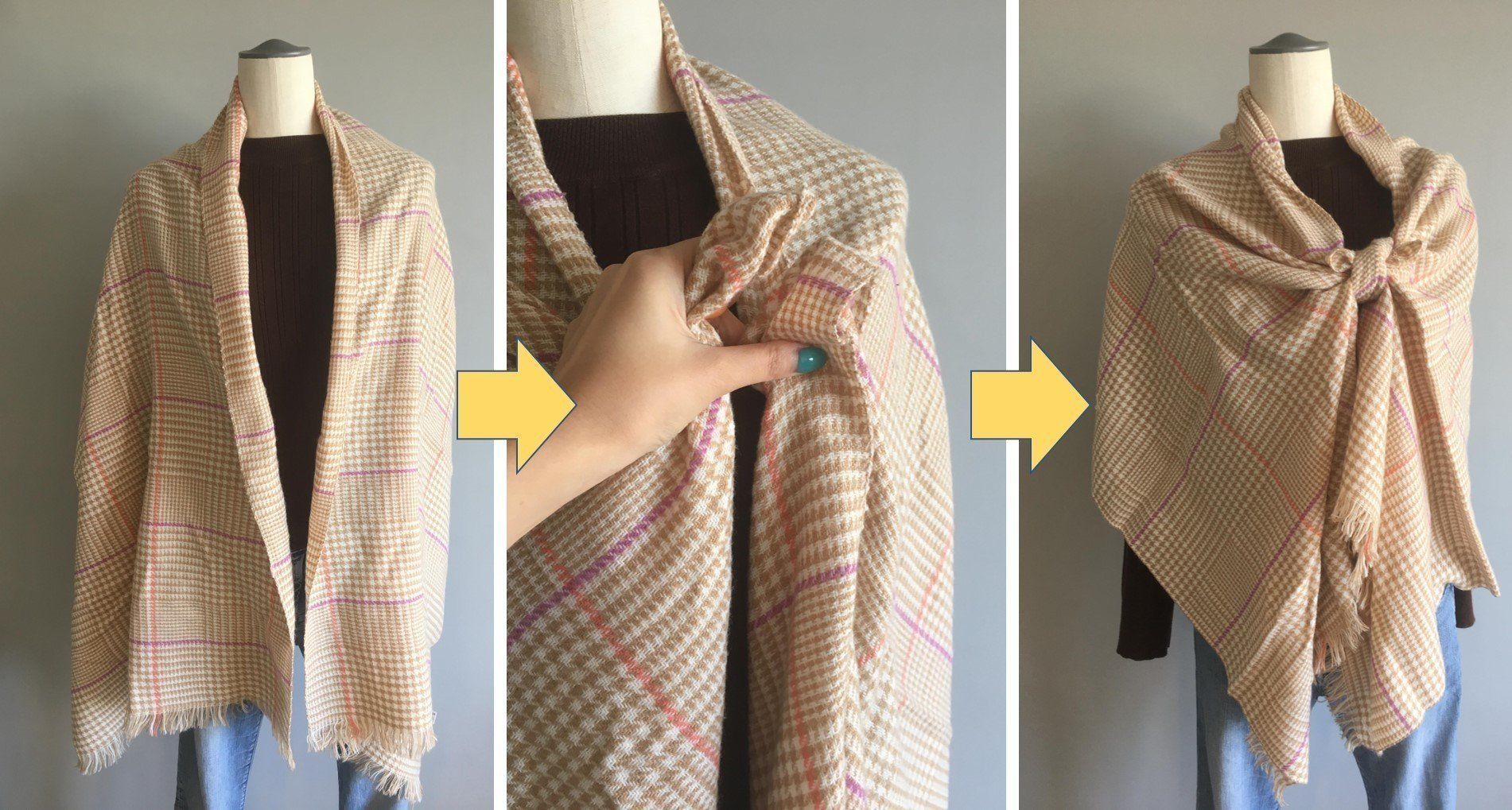 肩にかけて、胸のあたりで左右とも5センチほどつまんでその部分を固結び(2回しばる)するだけ! 結び目を正面よりも少しサイドへずらすとこなれ感もアップ! 画像のようにノーカラーコートの上からも出来ちゃうアレンジです。