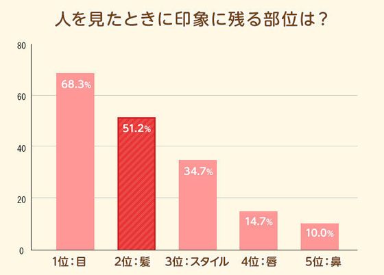 グラフのとおり、人を見るときに印象に残るのは「髪」だと答える人が全体の半数超えに! 「目」に次いで、「スタイル」よりも「髪」が人の印象を左右する大切なパーツだということがわかります。