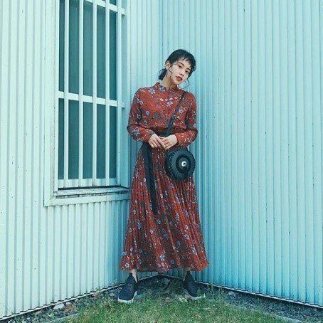 こまかいレトロな花柄も、トレンドのハイテクスニーカー&ラウンドポシェットをプラスすれば、一気に抜け感のあるイマドキなワンピースコーデに変わりますね。