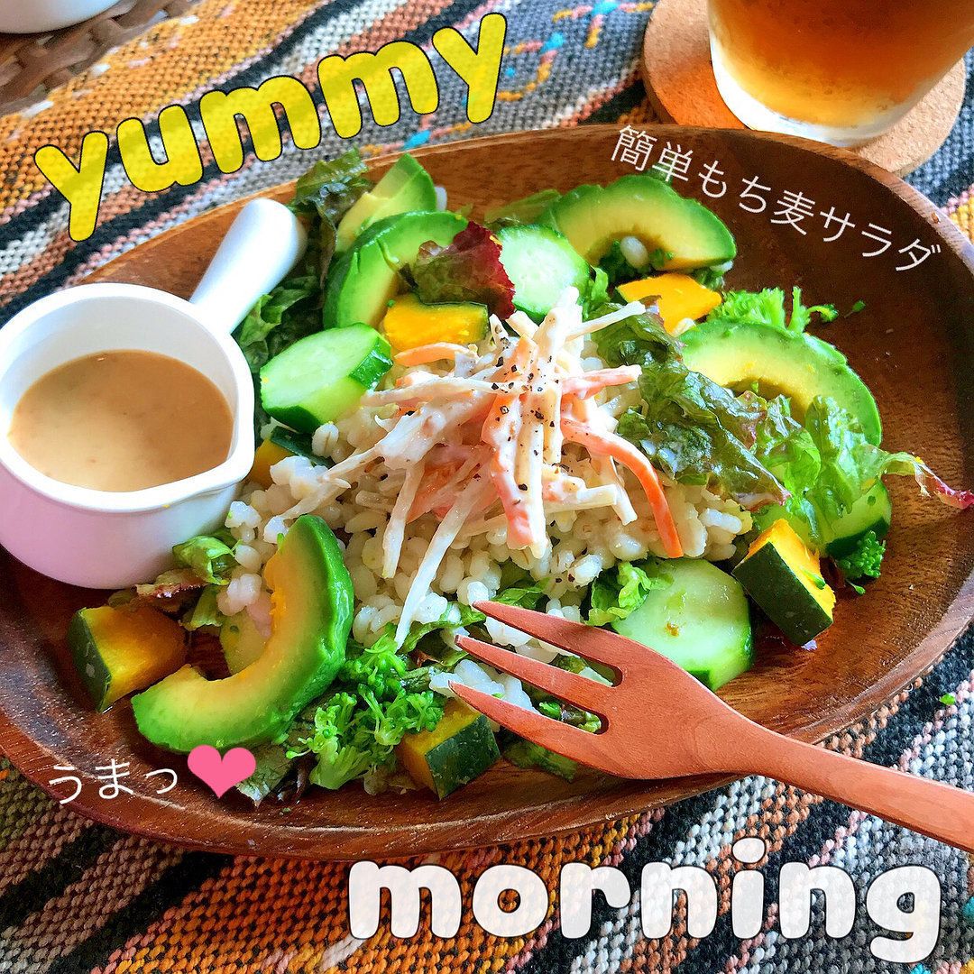 sachi_diet_さんは、ダイエット食材として話題の「もち麦」を活用しています。こちらは、もち麦にサニーレタス、きゅうり、アボカド、蒸しかぼちゃ、ブロッコリー、レンコンサラダをのせたもち麦サラダ。ブラックペッパーとお好みのドレッシングをかけていただきます。もち麦はお米と混ぜて炊いても、もち麦だけで炊いてもOKです。