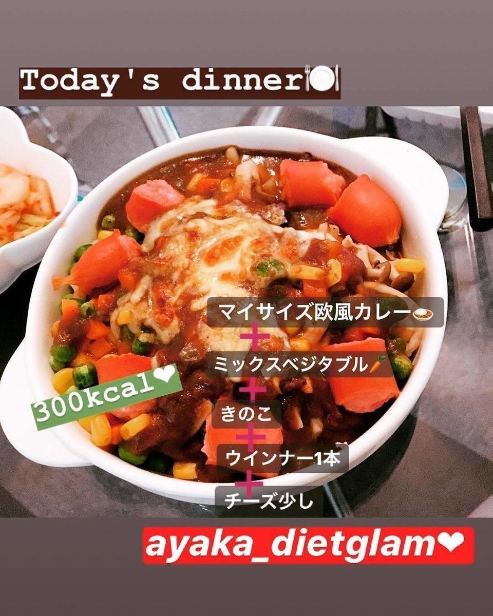 ayaka_dietglamさんのこの日の夕飯は、量とカロリーが控えめのレトルト食品「マイサイズ」シリーズの「欧風カレー」。ルーにミックスベジタブル、きのこ、ウインナー1本、チーズを少しプラスして、たったの300kcalに収まりました。夕飯は遅い時間にならないよう、大体18時~19時頃に食べることが多いようです。
