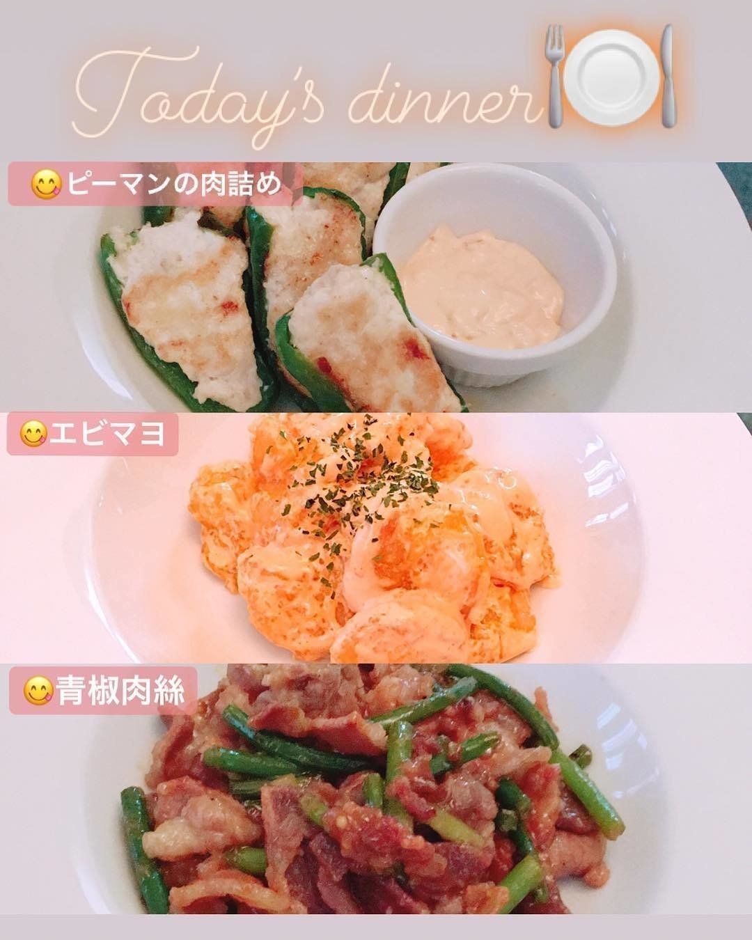 ダイエット中でも食べられて、パートナーのおつまみにもなる夕飯として、中華料理を作ったayaka_dietglamさん。メニューは、ピーマンの肉詰め、エビマヨ、青椒肉絲。ピーマンの肉詰めに使うお肉には「鶏ミンチ」を活用し、ソースとして多めに作ったエビマヨのソースと梅肉を添えました。