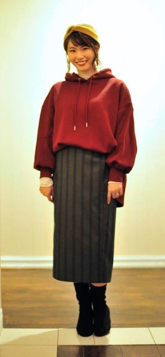 カジュアルな印象が強いパーカーには、あえてインにレースのトップスを重ねて甘さをプラス。ストライプのIラインスカートでスッキリ感をアップできます。ターバンをつけることで視線をアップさせ、スタイルよく見せられます。(モデル/北脇可奈子さん)