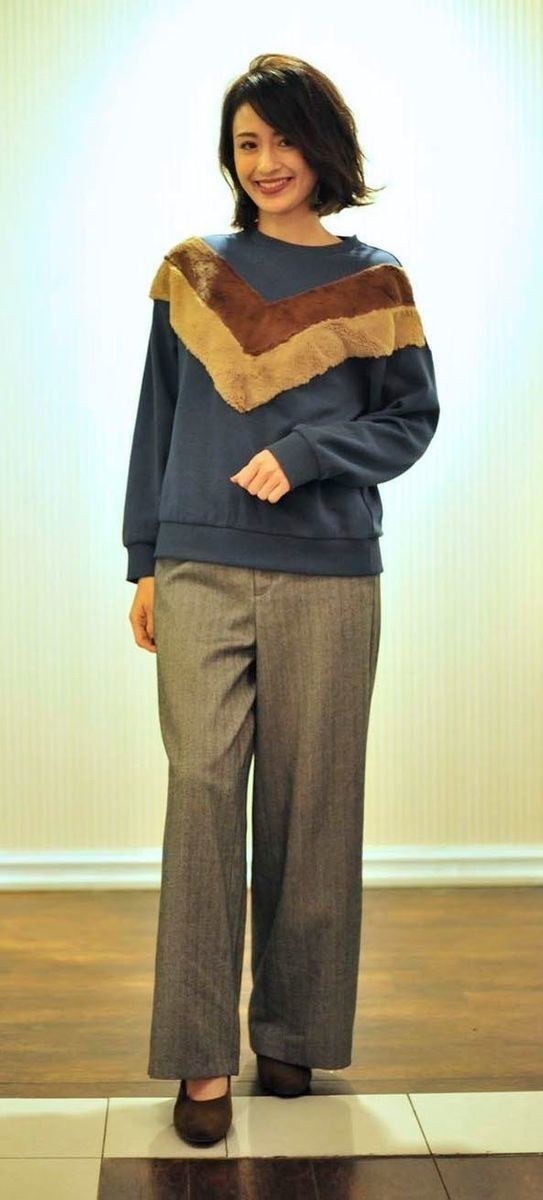 ブルーのベースにVネック状のブラウン系のカラーブロック切り替えが印象的なスウェットに、ストライプの太めパンツと言う辛口マニッシュな組み合わせ。ヒールパンプスを合わせて、今年らしくフェミニンなムードをプラスしました。(モデル/中目友理さん)