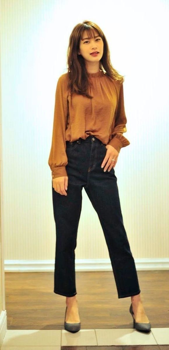 スッキリとしたシルエットのアンクルデニムパンツに、明るいブラウンのサテンブラウスをコーディネート。チェック柄のパンプスを合わせて今年らしさを演出しました。(モデル/さおりさん)