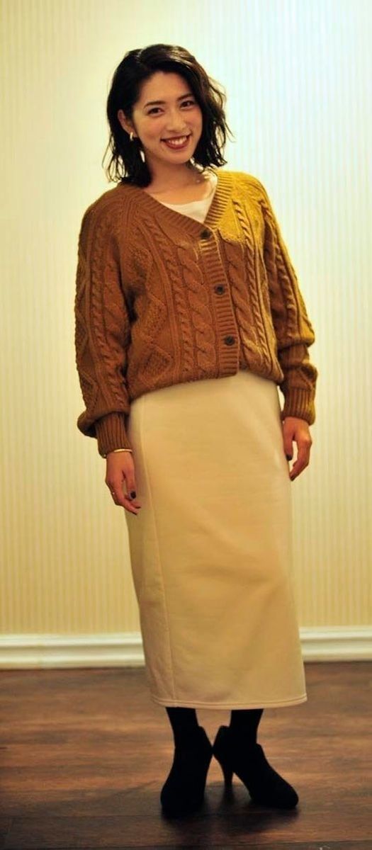 ざっくりとしたケーブル編みが今年らしいカーディガンには、タイトスカートを合わせてスッキリとしたIラインに仕上げ。ヒールのあるブーティでスタイルアップ。(モデル/山本美智代さん)