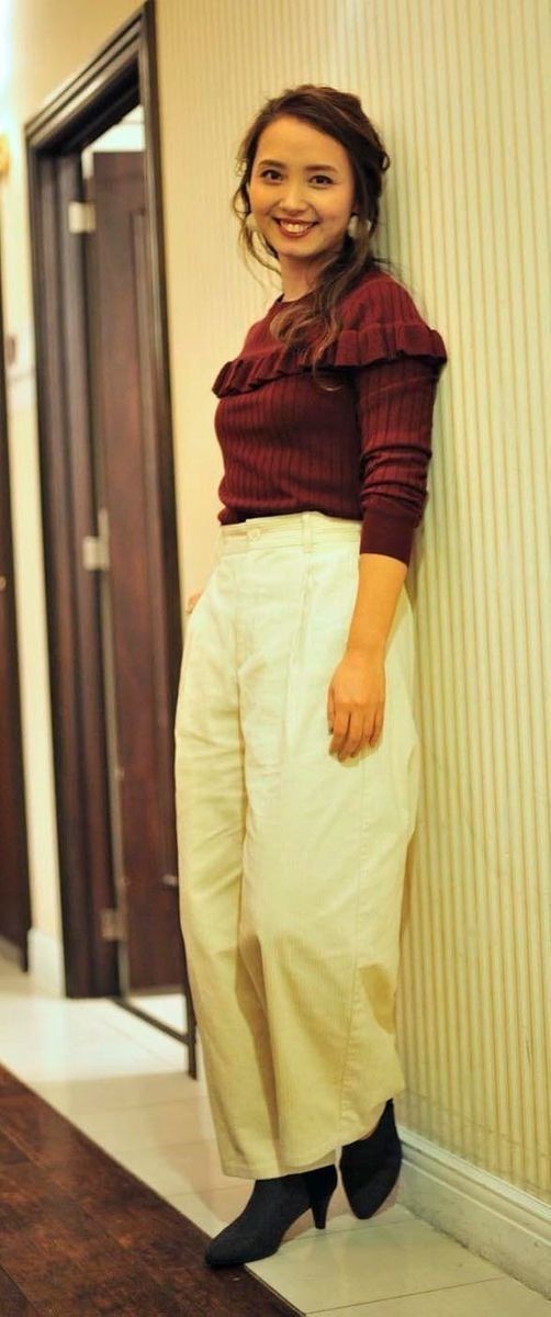 フリルニットの甘いムードをコーデュロイのワイドパンツでほどよく抑えてメリハリのあるコーディネートに。ふわふわのファーイヤリングで顔まわりに華やかなアクセントをつけました。(モデル/岡田なつこさん)