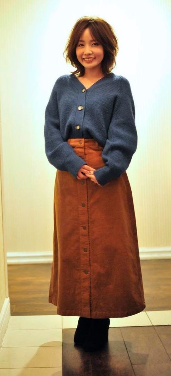 今年流行中のオーバーサイズのトップスは、Vネックを選んで首もとをスッキリと仕上げて。Aラインスカートにトップスをインすることで、ほどよいボリュームに落ち着きます。(モデル/榊山登紀子さん)