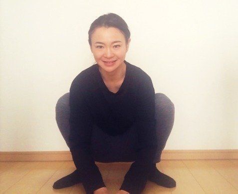 カエルのように、しゃがんだ状態で足と足の間に手をつきます。