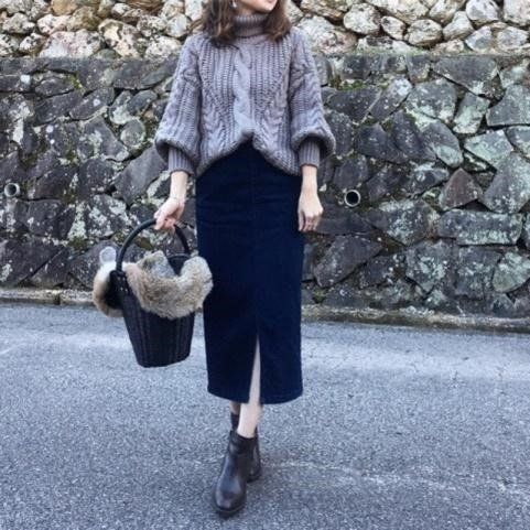 次はふんわりしたローゲージニット。太って見えるかと思われがちですが、袖をふんわりとたくし上げ、手首を見せることで細見え効果も!トップスの裾も軽くフロントインして、トップスの裾ラインに動きを付ければ心配なお腹やヒップ周りもOK!