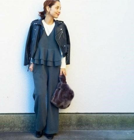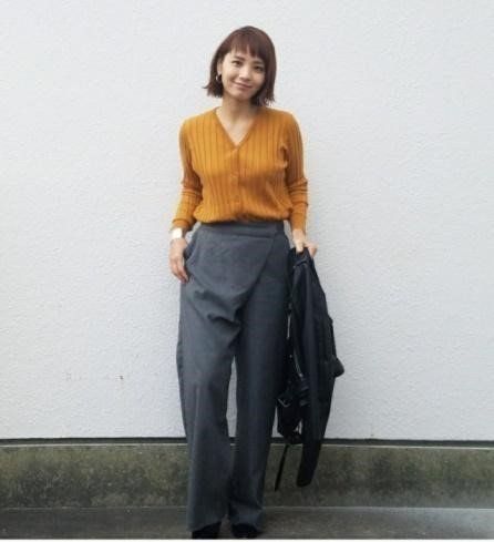こちらはラップ風デザインのワイドパンツ。斜めのラインが下腹部分をしっかりカバー。また敬遠しがちな、トップスのウエストインをすることで、逆にくびれを作って、スマートシルエットを作ることも!