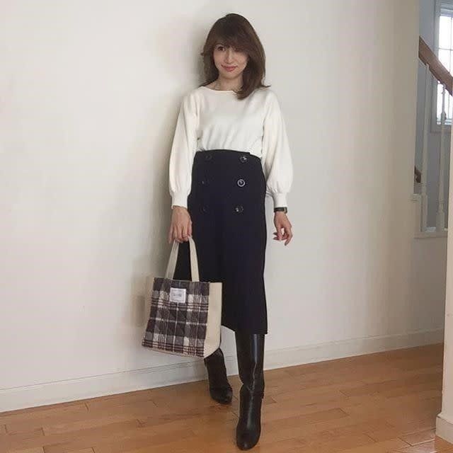 例えば、写真のようなボタンデザインのある、タイトスカート。コーディネートカラーも白&ネイビーでコントラストを付ければ、スマートな装いに。