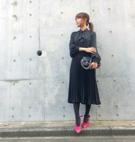 写真のように、ボトムスはプリーツスカートでボリュームがあっても、ボウタイで目線をUP!さらに足元にビビットなカラーを添えれば、差し色効果で、目線を足元に流せますよ。